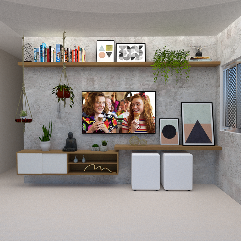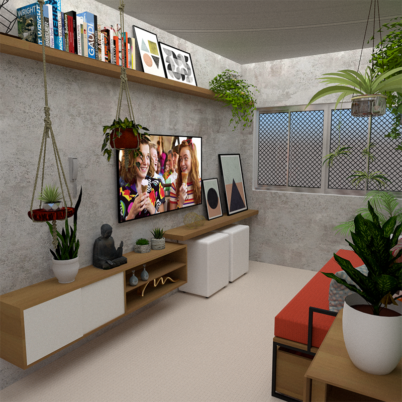 Esse projeto foi feito para um jovem casal sem filhos, mas que possuem em sua família, também, uma gata e uma cachorra com acesso a todos os cômodos do apartamento. Por isso, os móveis da sala são suspensos e o sofá é feito sob medida em metalon e madeira, evitando que a cachorrinha faça-os de mordedor.