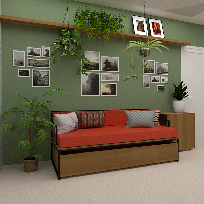 O sofá também se transforma em uma bicama de solteiro, para os hóspedes e as cores puxadas para tons terrosos foram pensados para combinar com as plantas que a dona faz questão de cultivar pela casa.